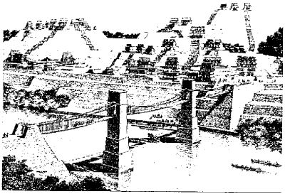 We hardly need more than the accompanying drawing to amplify our brief item (in SF#103) on that remarkable 7th. Century Mayan suspension bridge at Yaxchilan, in Mexico. Its three spans stretched 600 feet. The wooden deck was 10 feet wide and was suspended by large-diameter hemp ropes - probably bundles of six 1-inch ropes, according to modern calculations. The towers of the two bridge piers were 35 feet across and built up from large, flat stones (4 x 4 feet) set in bedrock. European engineers did not build a larger bridge until 1377! The following reference contains much more information.
